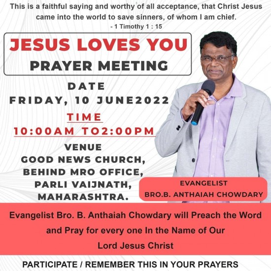 Bro. B.Anthaiah Chowdary received a call from our Almighty God and being anointed by the power of the holy spirit as an Evangelist, with a burden for the lost souls, started to take the good news of Salvation by a Divine Grace to many states of India like, Maharashtra, Chattisgarh, Orissa, Bihar,Gujarat, Uttar Pradesh, Karnataka, Andhra pradesh and Telangana.